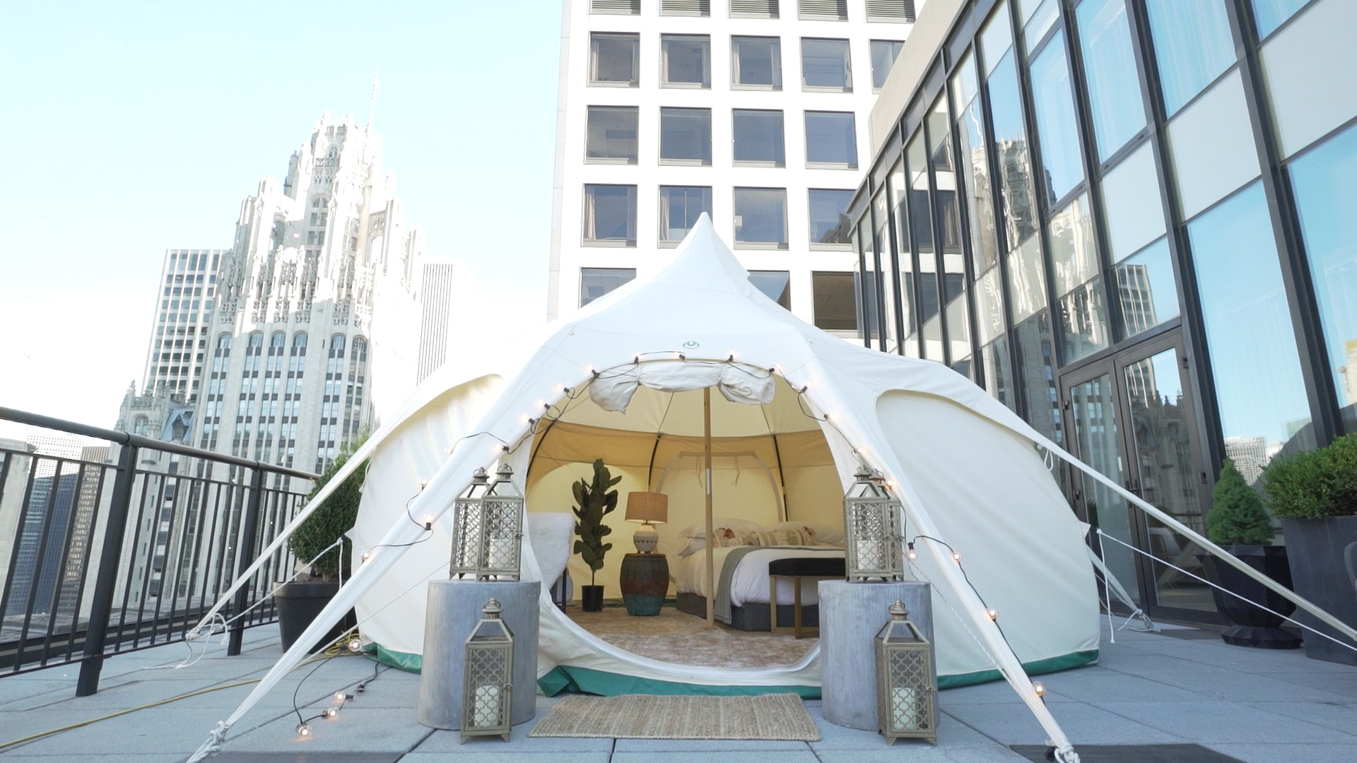 We recently teamed up with The Gwen Hotel in Chicago to produce a video highlighting the city’s first ever urban glamping experience. The event takes place 16 floors up on the terrace of their Gwen Lux Suite, where our drone artist flew the Mavic Pro Drone high in the sky to capture the suite’s scenic views of Michigan Ave. On the floor, we were able to capture the Lotus Belle bohemian-styled tent that guests spend a night under the stars in, along with footage of the luxurious two-bedroom suite that glamping guests also receive access to.